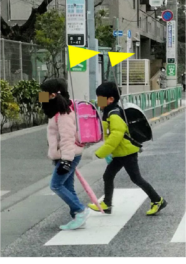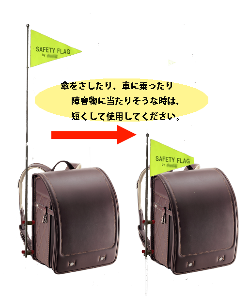 通学途中の学童のランドセルなどに取り付けて、走行中の車にいち早く察知してもらい、幼い小学生などの学童を交通事故から守ってあげるのに役立ちます。車高の高い車(トラックなど)からでも見やすいように伸縮出来るポールで出来ています。また、近年急速に増えている子供を乗せられる電動自転車などにも取り付けられます。子供を交通事故から守る。